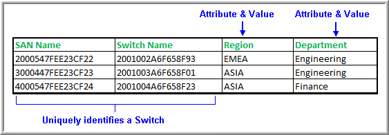 • First (Header) Row - Contains the fields that uniquely identify the SAN and Switch names, followed by Attribute names. The header row is information only and is not processed as a data row.