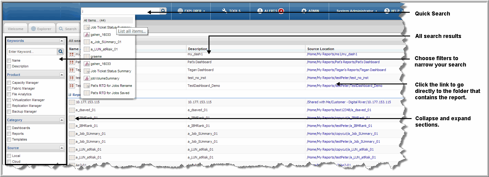 The Search Results page displays your Hitachi Storage Viewer inventory sorted by categories. If you’d rather just browse through all the reports, templates and dashboards that you have access to, use the Explorer.