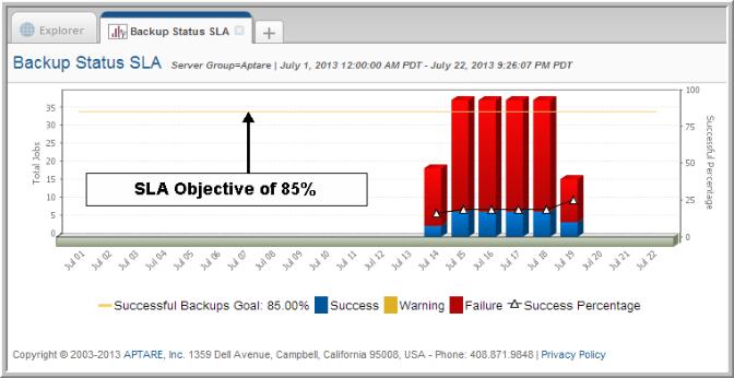 The SLA percentage represents the expectation for backup success. So, if you set an objective of 85, you can monitor the success for daily backups, using the Backup Status SLA report, as shown in the following screen shot.