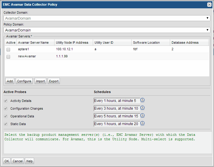 Configure | Click Configure to revise or add information to the Avamar server you selected. See also Adding/Configuring an Avamar Server within the Data Collector Policy Window. |