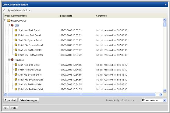 The last update and status from the individual collectors are aggregated up to the Data Collector/Master Server level. Collectors can be shown or hidden using the +/- icon.