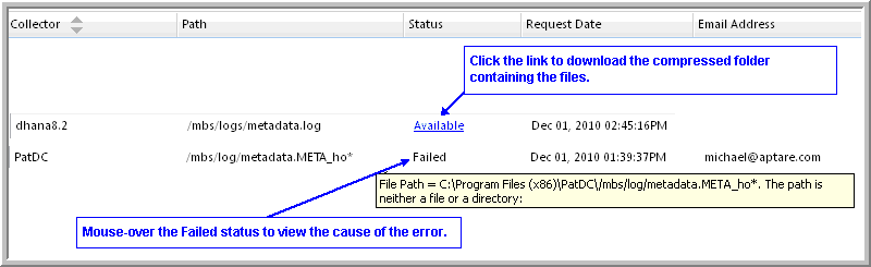 Path to File/Folder* | Enter an explicit path to the folder/file to be downloaded. The path will always be relative to the <APTARE_HOME> folder. Therefore, you should not include the explicit <APTARE_HOME> portion in the path. For informational and troubleshooting purposes only, know that <APTARE_HOME> is typically configured to be: /opt/aptare on Linux and C:\Program Files\aptare on Windows. Use the asterisk (*) wildcard to include multiple files. For example, /mbs/logs/metadata.META.*.log Two dot (“..”) notation, to move up the hierarchy, is not supported. In addition to log files, other files useful for troubleshooting can be downloaded; for example, collectorconfig.xml or updateconfig.sh. The most common location from which to download logs is: /mbs/logs. |