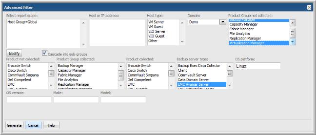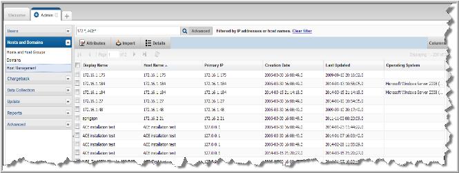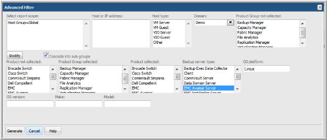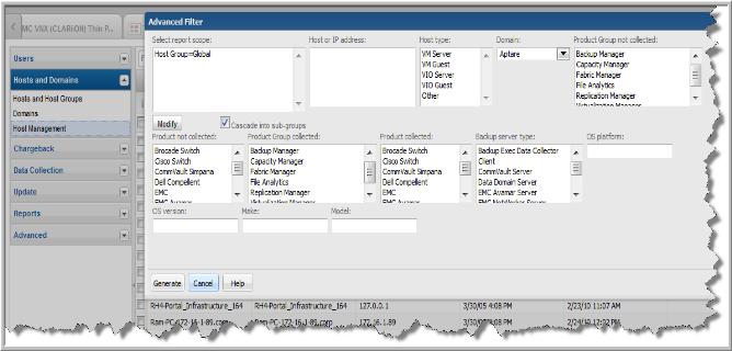 Filtering provides a convenient method to refine your view by locating one or many hosts. You can filter by multiple host names, IP addresses, or any combination of the two. Using the Advanced button on the Host Management page, you can further filter your view with a number of additional parameters such as product, backup server type, host type and so on. Example scenarios are provided at the end of this section.