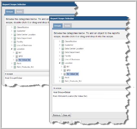 You can customize the results by selecting not only what you’d like in, but also what you’d like left out. For example, find hosts that have not been collected from a particular subsystem, such as Symantec NetBackup. You can also set no value for an attribute as part of the scope. For example, if all your hosts should have a value for a region attribute set, you can select “no value” for the region attribute to yield the list that you can then use to assign attributes. See