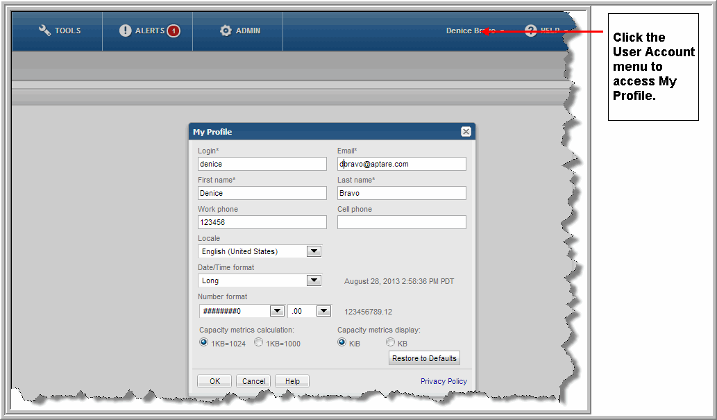 • Capacity metrics calculation - When 1024 is used for calculations, it refers to binary multiples: kibibyte (KiB), mebibyte (MiB), gibibyte (GiB), tebibyte (TiB), and pebibyte (PiB). When 1000 is used for calculations, it refers to decimal multiples: kilobyte (KB), megabyte (MB), gigabyte (GB), terabyte (TB), and petabyte (PB). By default, the units for values in reports are displayed as binary multiples. This default setting can be changed by modifying a user's profile.