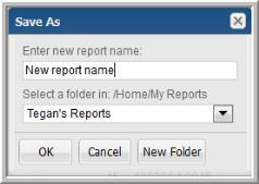 When you save a report, you are saving the definition and parameters, not the report output. Because you only save the reporting parameters and not the actual report data, you do not need to worry about running out of disk space. Each time you launch a saved report, the report’s data refreshes. If you intend to access this report often, consider creating a dashboard and setting it as your home page.