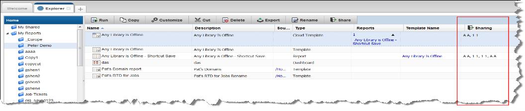 As the report/folder creator, you can modify and delete your shared reports and folders. Use the Explorer to view properties associated with shared elements. This information can be useful to determine the impact of modifications or a deletion. Reports listed in the Explorer indicate if sharing is active, and identifies who the report is shared with.