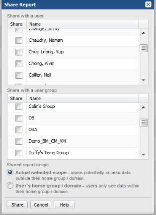 Sharing is a privilege based on ownership. Reports and dashboards must be saved before they can be shared. You can share a report or dashboard with any number of users or user groups. Reports in a shared folder inherit the sharing properties of the folder. You do not need to set the sharing properties on each report. The folder properties will append any properties set on the individual reports.