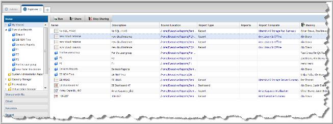 Use the Explorer tab to view properties associated with shared reports. This information can be useful to determine the impact of stopping the sharing, modifications to the report, or a deletion.