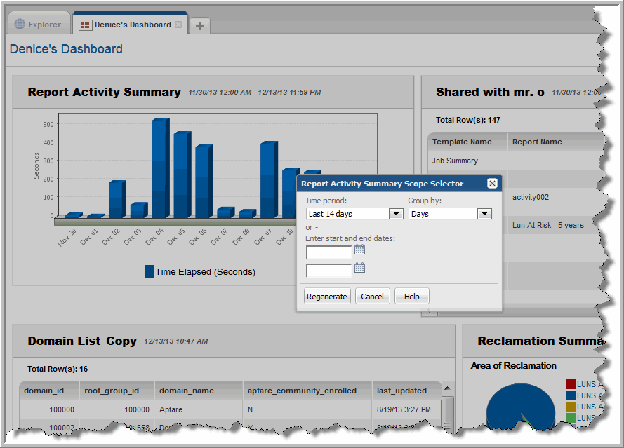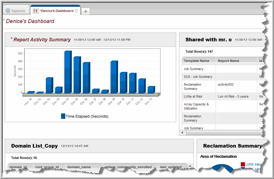 Acting as a canvas, dashboards provide an at-a-glance overview by displaying many reports on a single page. You can drag and drop individual reports, to create a consolidated view into your storage environment. You can create a dashboard to contain reports you access regularly, or view multiple scenarios simultaneously. Dashboards can also help you troubleshoot a particular problem by gathering data from multiple reports into one view.