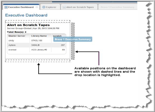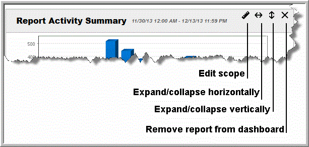 Once placed on a dashboard, you can expand and collapse reports based on page real estate. These functions are displayed when you hover your cursor over the report title. You can change a report location by simply dragging it to a new position.