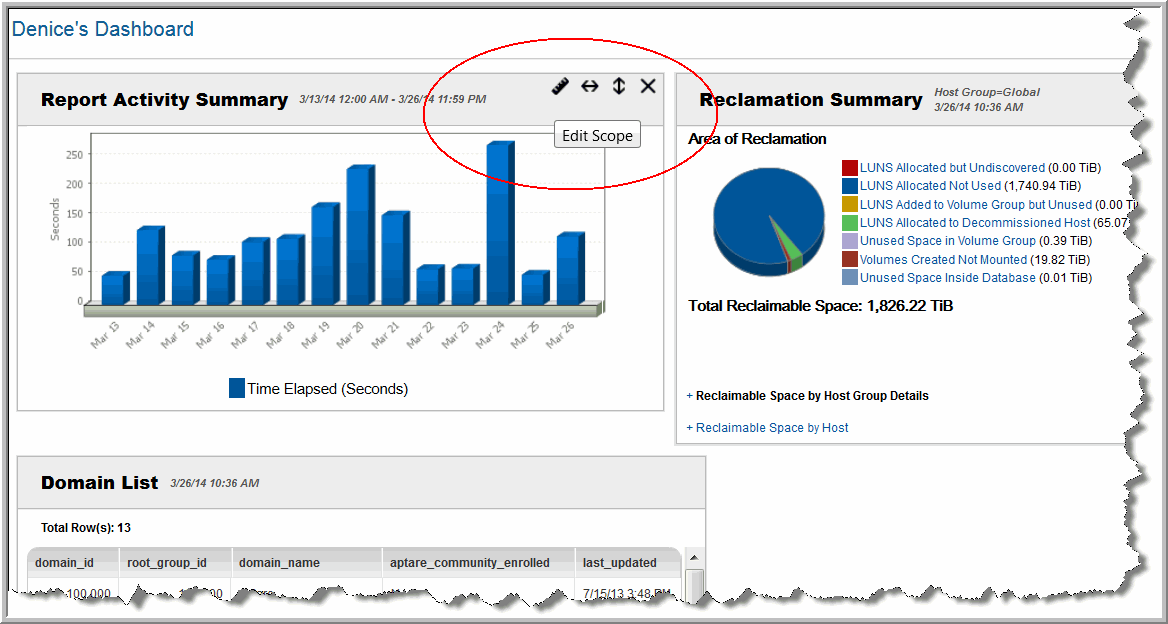 3. Roll your cursor over the corner of a report on the dashboard to display the Edit Scope icon.