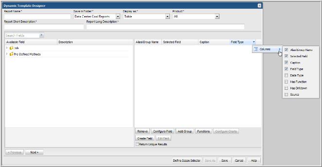 • Column Selector - Hover your mouse over any column header in the Selected Fields section at the right of the Dynamic Template Designer window. This reveals an arrow, which when selected, provides a list of columns that can be added or removed from this portion of the window. For example, you may want to add Has Function to the window so that you can easily identify which fields have had a function applied.