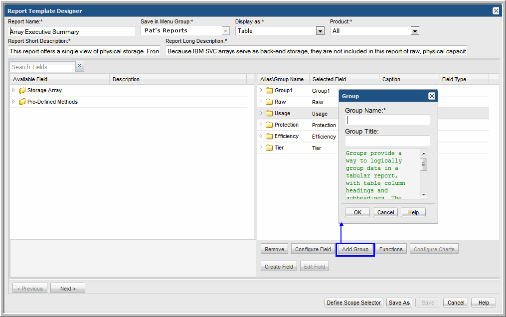Groups provide a way to logically group data in a tabular or line chart report. In a tabular report, it enables table column headings and subheadings. In a line chart report, each group will be rendered as a separate line chart and the group name will be used as the chart header in the report. Once a group is added to a template, every field in the template must reside within a group.