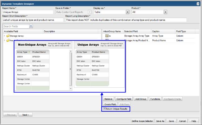 A simple use case might be a list of array types by product. The following example illustrates the results, before and after the Return Unique Results checkbox is checked.