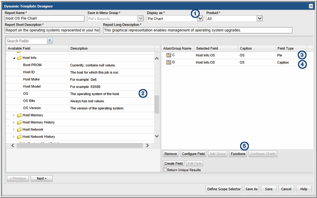Design a Pie Chart. Note that the HostInfo.OS field is used twice in this template, one for the Pie and one for the Caption. Also, for the Pie field type, a COUNT function must be applied.