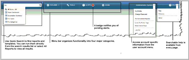 3. User Account Menu - This drop-down menu provides convenient access to account-specific features such as managing your profile information, your homepage, and access to your scheduled reports.