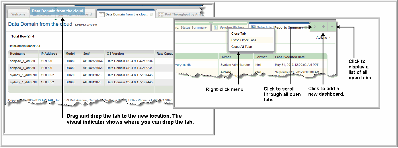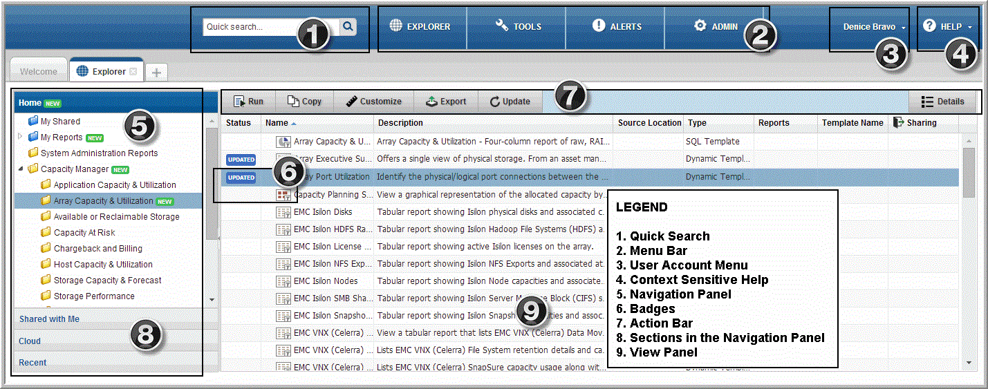 9. View Panel - This management panel is a window into your reporting inventory, allowing you to browse through and manage Storage Viewer templates, reports and dashboards. You can quickly identify when new/updated templates are introduced and choose to update or not. You can view mappings between reports and templates, if sharing is enabled, detailed report descriptions and other information. On the management side, you can create, edit, and delete reports, plus organize them into a folder structure that is relevant to your business. See also
