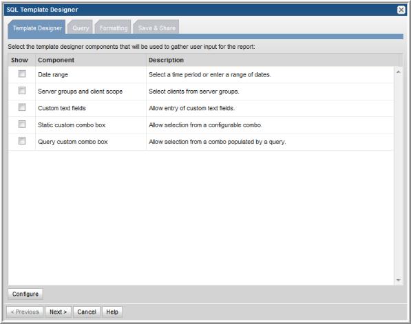 Template Designer | Using the checkboxes, select which parameters you want the user to specify in the Scope Selector window when the report is generated. After you complete the selections within the tabbed Report Designer window, click Next to go to the window where you will Specify the SQL Query. |