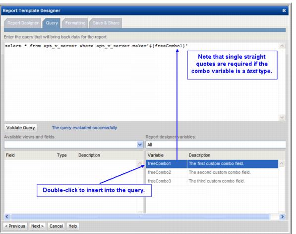 4. In the Query tab, enter a SQL query that will use the value selected in the populated combo box. For example: