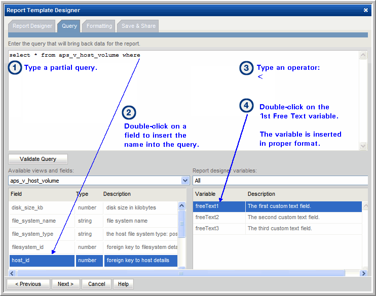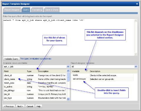 Query | Type your SQL statement using the list of valid database views and fields at the bottom of the window. Click Validate Query to check your SQL statement for valid syntax before moving on to formatting and saving. This Validate Query task actually executes the query in order to validate the syntax. Seemingly simple queries could return a large amount of data and therefore may take some time to validate. See Specify the SQL Query. |