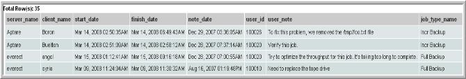 The following example lists the jobs with notes within the selected time frame, ordered by server, host, job start date, and note entry date. This particular report provides a quick look at jobs that may need attention because someone has attached a note to the job.