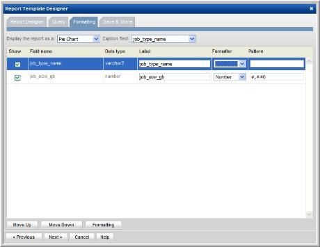 Formatting | To format the output for a report template, select the information that you want included in the report, as well as the report output style—Table, Bar Chart, Pie Chart, or Pivot Table. See Format the Output. |