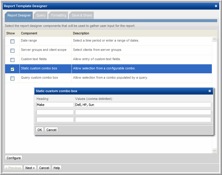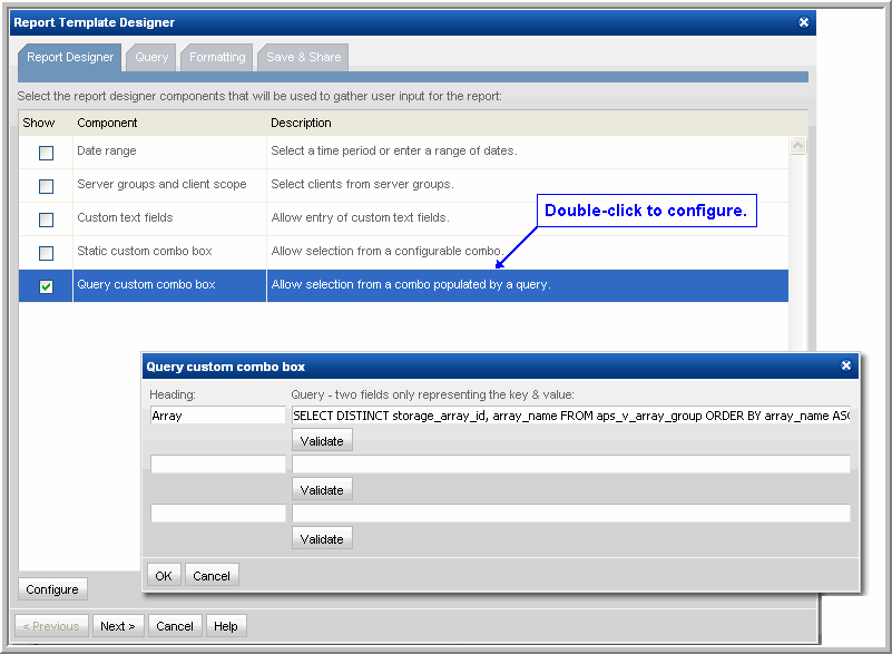1. In the Template Designer component, double-click Query custom combo box to access the configuration window.