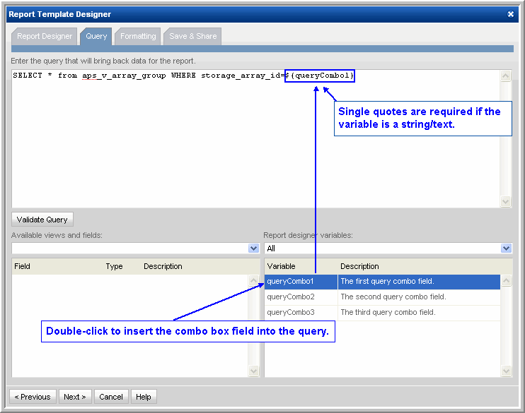Key field, Field value | The comma-separated key-value pair is derived from a published view. For example: Key: storage_array_id Value: array_name The Key in the key-value pair is what will substitute the ${queryCombon} variable and the Value is shown in the Combo box. See the Hitachi Storage Viewer Database Programmer’s Reference Guide for descriptions of the published database views, including the available fields. In addition, these views and fields are available via the SQL Template Designer Query component. See Specify the SQL Query. |