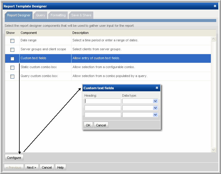 1. In the SQL Template Designer, select the Custom Text Fields component and click Configure.