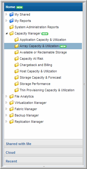 • Home - Contains folders for reports you’ve shared with other users and user groups, folders you’ve created, and the Storage Viewer system report template inventory. System report templates refer to general product related report templates. User report templates refer to reports that users have either created using the Dynamic Templates Designer, the SQL Templates Designer or saved from system templates. These folders can also be identified by color. User folders are blue. System folders are yellow.