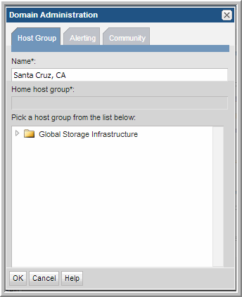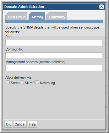 2. Click Add to display the Domain Administration window where you will configure both the Domain’s home host group and Alerting—SNMP trap details.