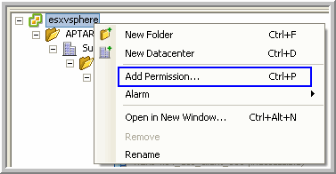 9. At the left of the vSphere window, right-click on the Root of the tree—in this example, esxvsphere—and then select Add Permission.