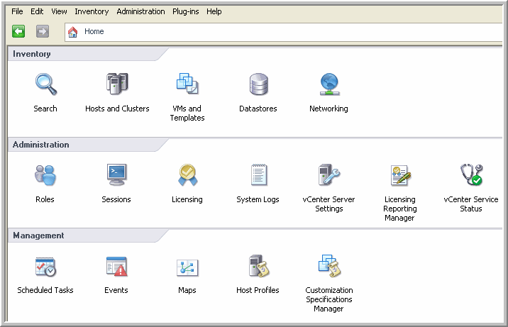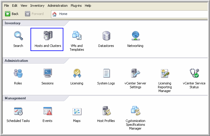 8. At the top of the vSphere window, select Administration > Inventory > Hosts and Clusters.