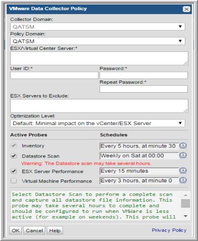 Inventory | By default, this probe collects data from VMware using the defined schedule. For performance reasons, this collection only gathers information on files currently in use by VMs collected by this probe. This includes VM disk files, suspended state, etc. Due to limitations in the data returned from VMWare, this probe may miss certain files, such as ISO files that are attached to virtual DVD drives. To capture all datastore file information including the files associated with VMs in the inventory, select the check box: Datastore Scan. If the Datastore Scan probe is not regularly run, the Datastore Usage Breakdown report is likely to have a large Unknown category. For additional information, see Datastore Scan Collection and Reports Impacted by Datastore Collection. Click the clock icon to create a schedule. Every Minute, Hourly, Daily, Weekly, and Monthly schedules may be created. Advanced use of native CRON strings is also available. NOTE: Explicit schedules set for a Collector policy are relative to the time on the Collector server. Schedules with frequencies are relative to the time that the Data Collector was restarted. | */30 * * * * |